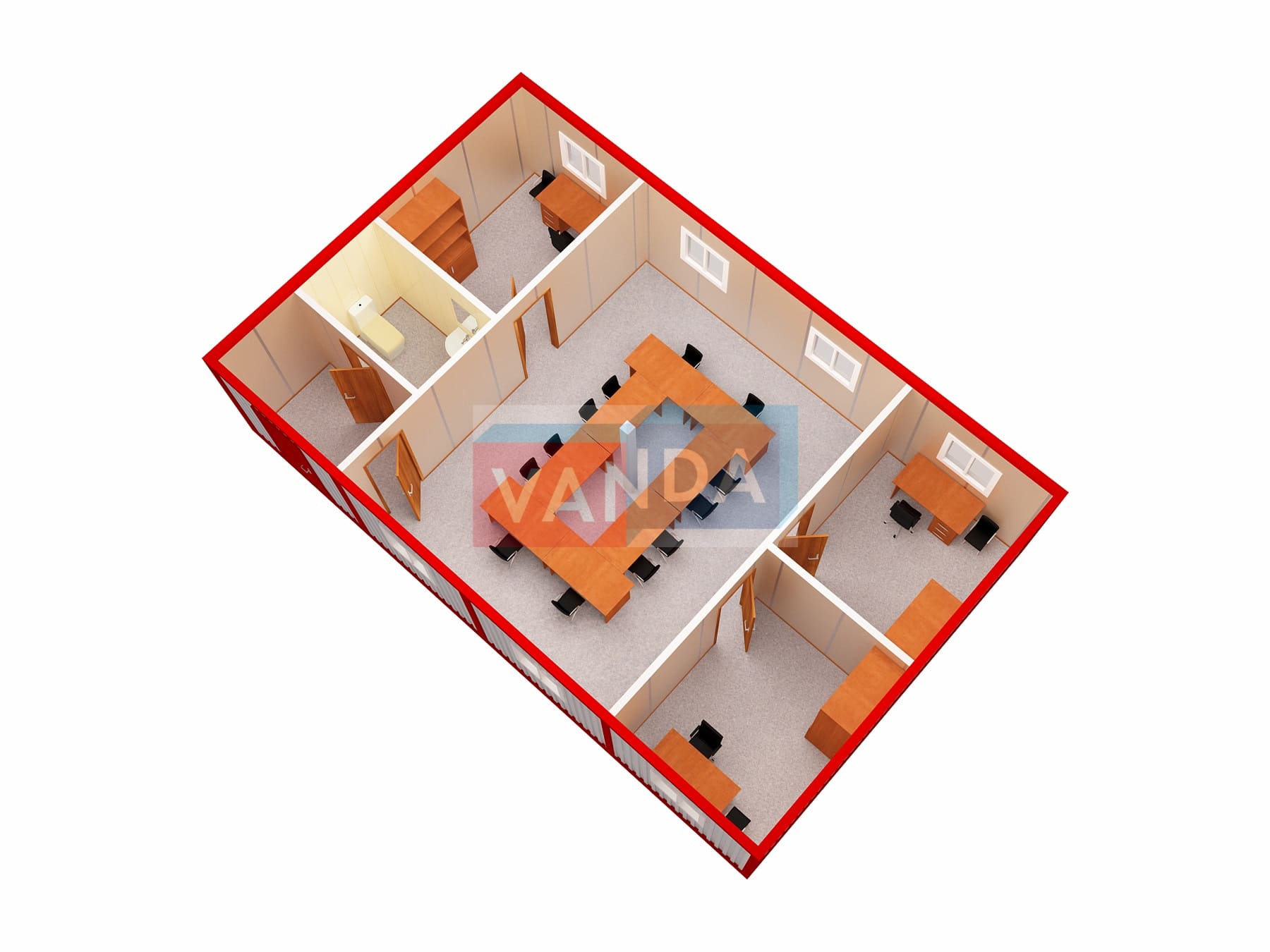 • В данном модульном здании можно заменить базовую внутреннюю отделку из панелей МДФ на любой вид внутренней отделки, например: ЛДСП,панели СМЛ или ГВЛО и т.д.