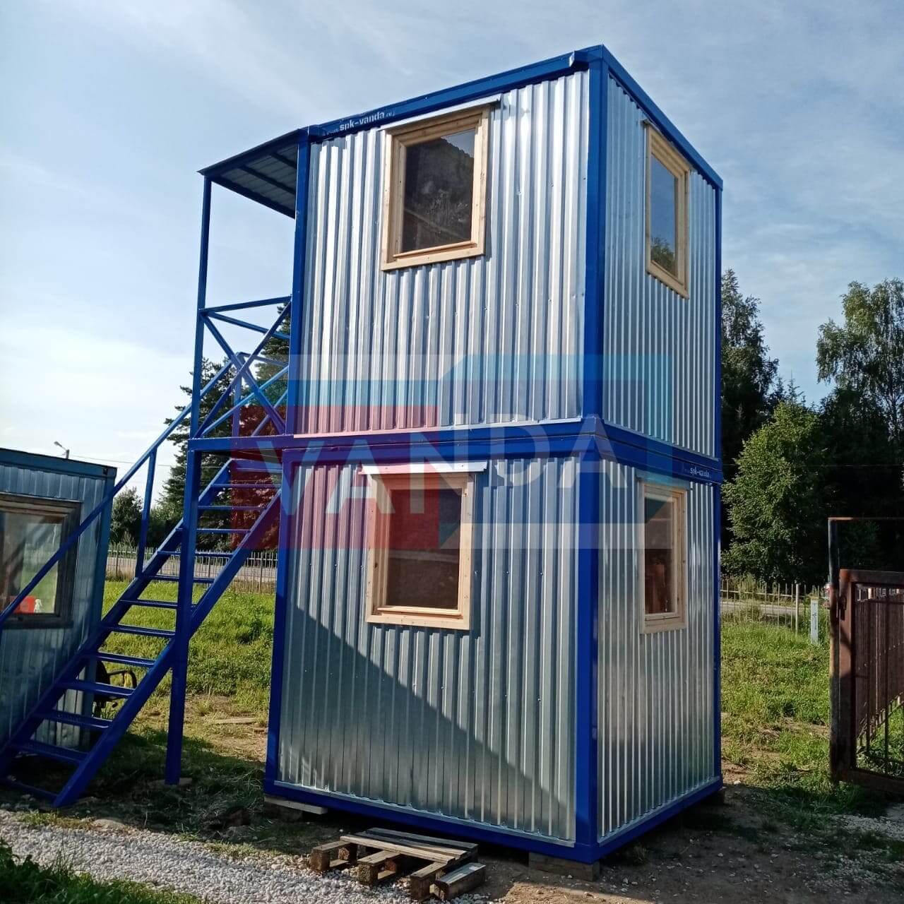 Пост охраны двухэтажный №1 (вариант 2) изготавливается из несущего каркаса (верхняя и нижняя обвязка): швеллер 100х50х3 мм., угловые стойки: сложно - гнутый угол 90х90х3 мм., крыша блок-контейнера: металл сварной 0,9-1 мм., качественная наружная отделка: оцинкованный профлист, вспомогательный деревянный каркас (стены) выполнен из брусок 40х75 мм., лаги пола: обрезная доска 40х100 мм., лаги потолка: обрезная доска 40х100 мм., выполнено утепление: Минеральная вата «ISOVER» – 50 мм. и пароизоляция: плёнка техническая, черновой пол состоит из: обрезная доска 20 мм. (2 сорт), чистовой пол покрыт: ДСП строительное 16 мм., отделка пола выполнена из качественных материалов. Контейнер комплектуется окнами: деревянное, двойное остекление 800х1000, входной дверью: ДГ 21-8 обшита снаружи оцинкованным листом, врезной замок и внутренними дверями. На второй этаж будки охраны ведет лестница с перилами, а площадка перед входом имеет ограждение. Если в БК присутствуют перегородки, то для них используется: брусок 40х50 мм.